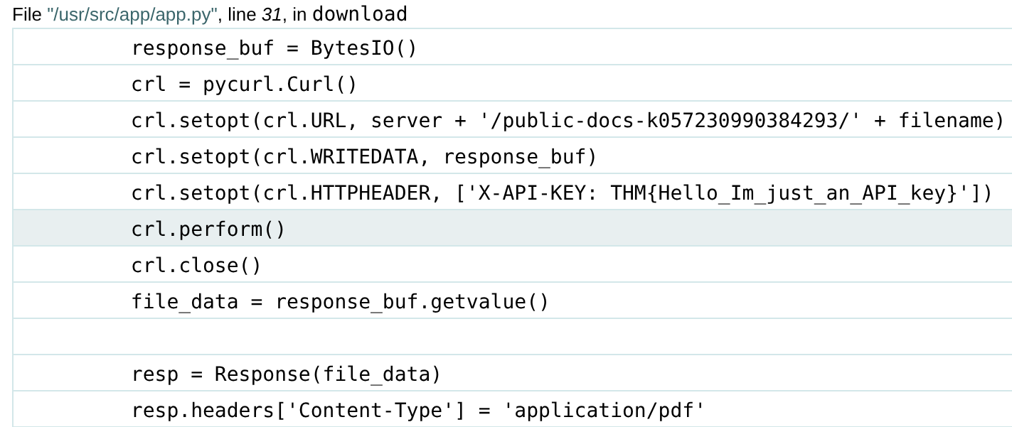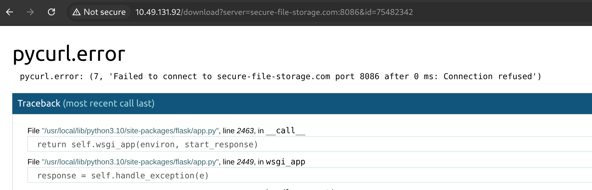 * Next I kept working the `/download` endpoint and triggered a pycurl error by modifying the port to an invalid value.
